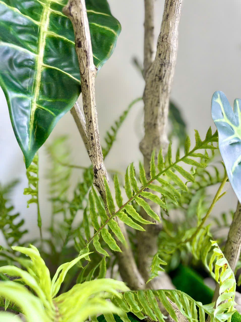 Bộ tiểu cảnh còn đi kèm các cây phụ như trầu bà, dương xỉ, hoặc những mẫu cây decor nhỏ khác, tất cả đều có độ hoàn thiện cao, lá mềm mại, màu sắc thật mắt và được cố định chắc chắn trên phần nền bám giả đất rêu phủ tự nhiên.