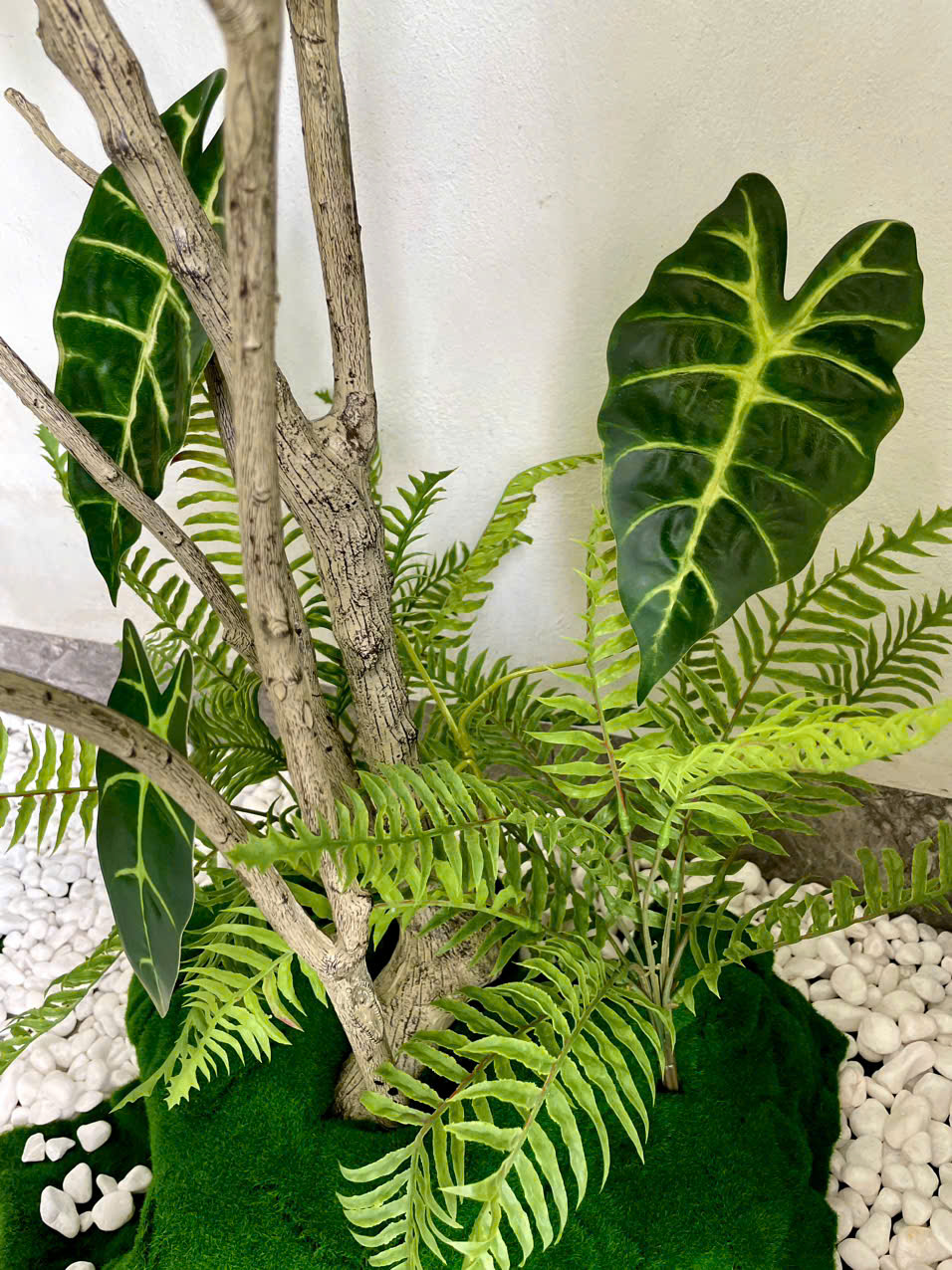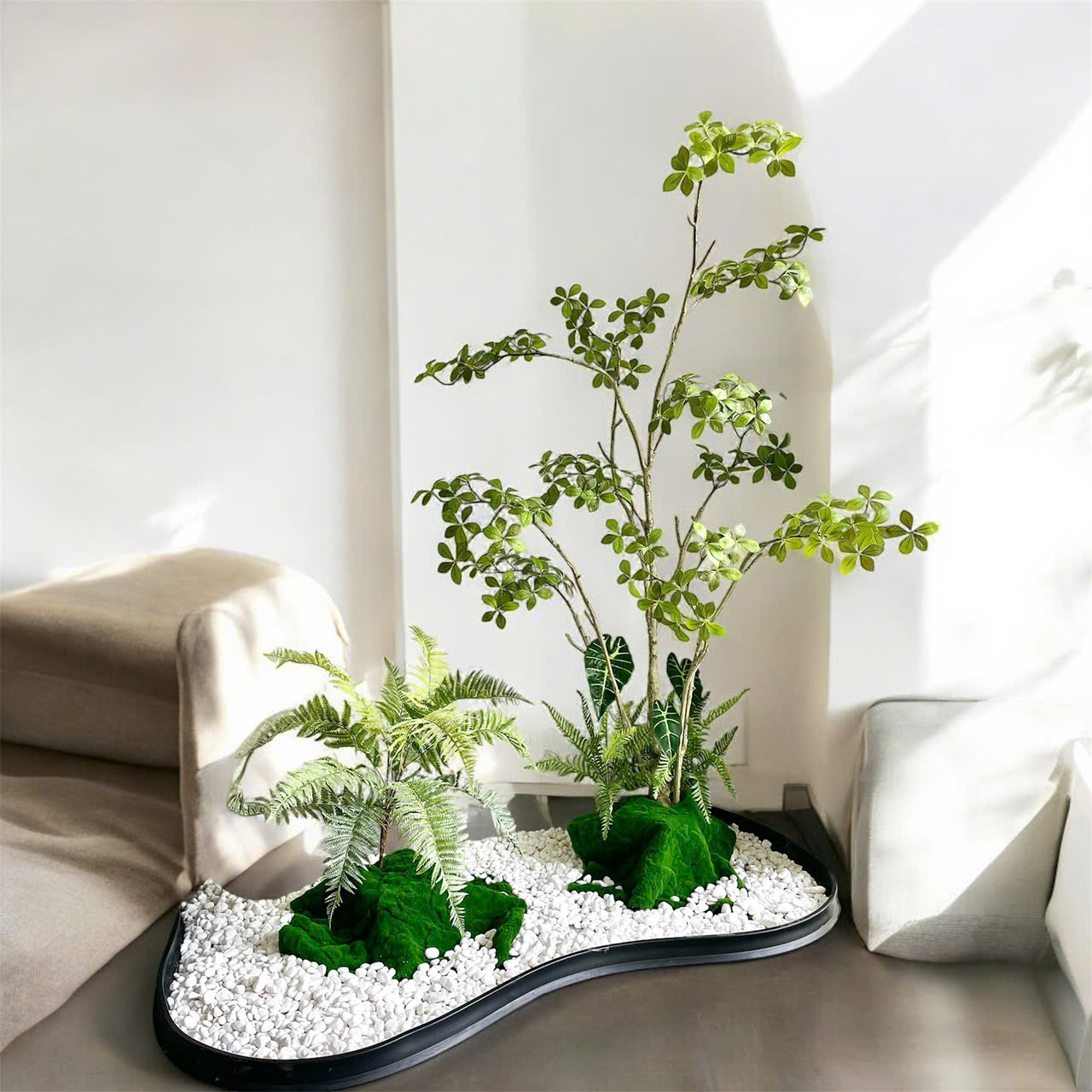 Tiểu cảnh cây giả không chỉ đơn thuần là một giải pháp trang trí nội thất, mà còn là một tác phẩm nghệ thuật mang đậm tính cá nhân hóa và thẩm mỹ đương đại. Với sự kết hợp tinh tế giữa cây Sơn Chi cao cấp và các loại cây giả nhỏ kèm theo, bộ tiểu cảnh này mang lại nét đẹp sang trọng, độc đáo cho bất kỳ không gian nào – từ biệt thự, văn phòng cao cấp, đến showroom, sảnh khách sạn hay căn hộ hiện đại.