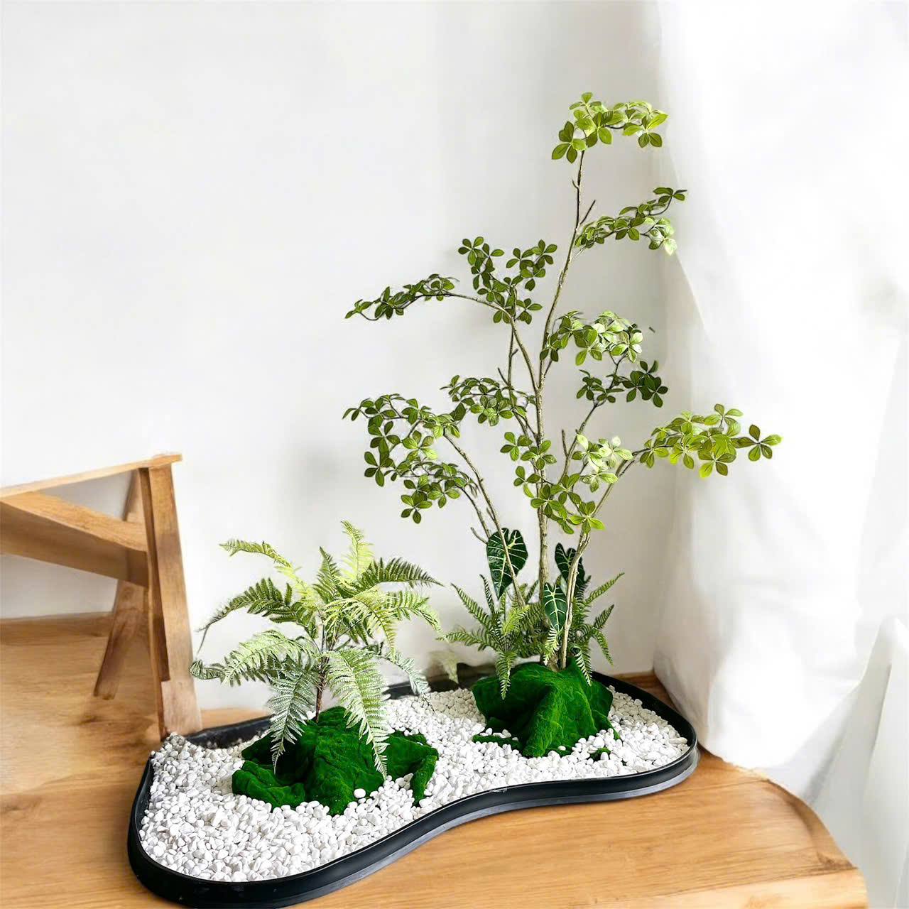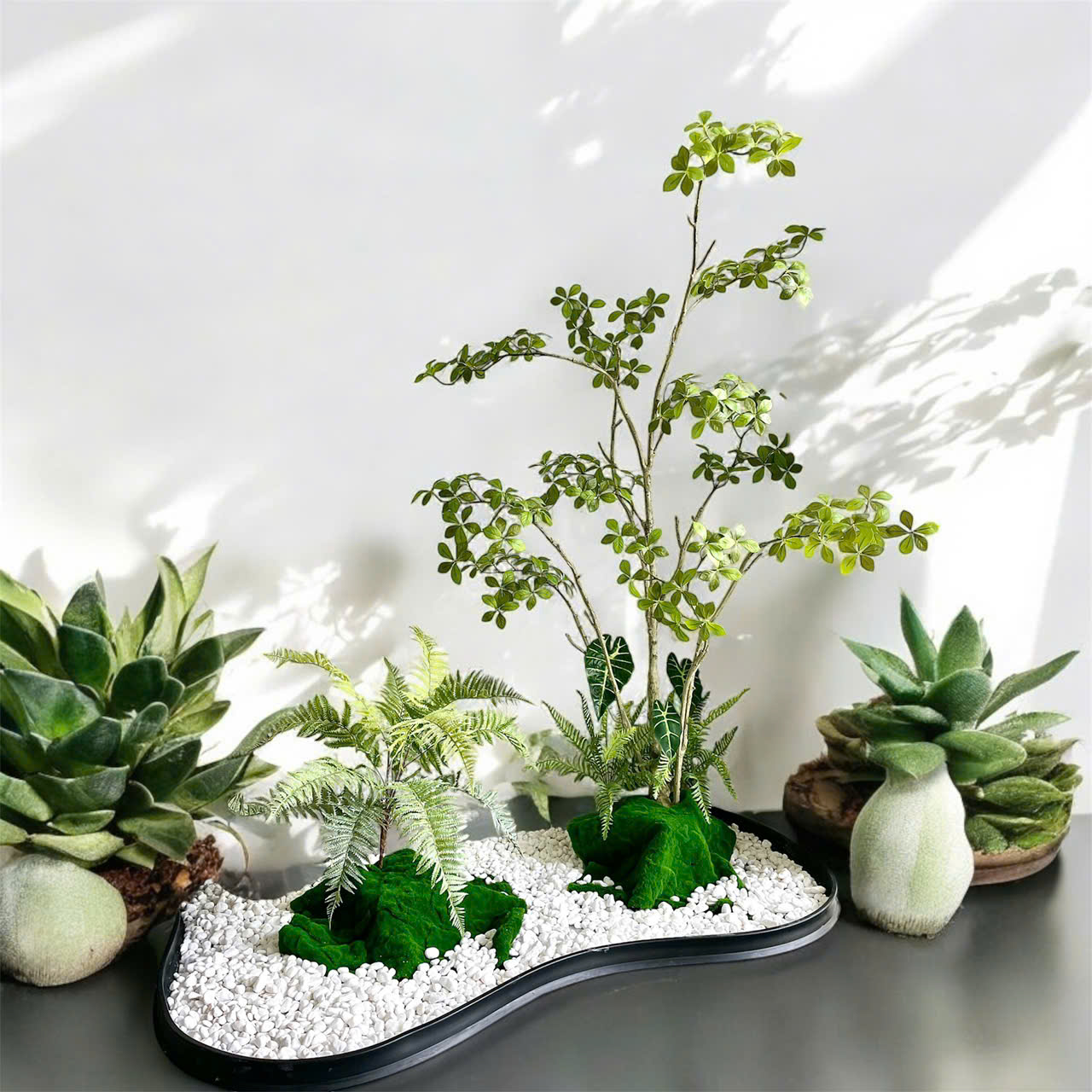 Một trong những ưu điểm vượt trội của mẫu tiểu cảnh cây giả này là khả năng tùy chỉnh bố cục một cách linh hoạt. Khách hàng có thể thay đổi vị trí các cây nhỏ, điều chỉnh chiều ngang – chiều dọc của tổng thể tiểu cảnh để phù hợp với không gian trưng bày. Thiết kế không đóng khung cứng nhắc mà hướng tới sự tự do, giúp bạn dễ dàng mix theo phong cách hình học, đường cong, khối xếp tầng hoặc lối tối giản hiện đại.